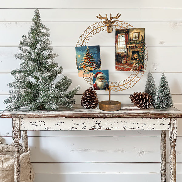 Crafted from sturdy metal with a charming distressed finish, this piece brings a touch of vintage farmhouse magic to any space. At 17 inches tall, it’s the PERFECT SIZE to display on a mantel, entryway table, or even as a centerpiece on your holiday buffet. The circular wire frame—topped with a whimsical deer head—adds character while giving you endless ways to show off what matters most: Christmas cards from loved ones, family photos, festive artwork, or even small keepsakes.