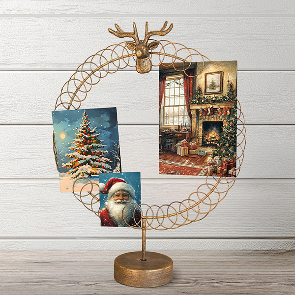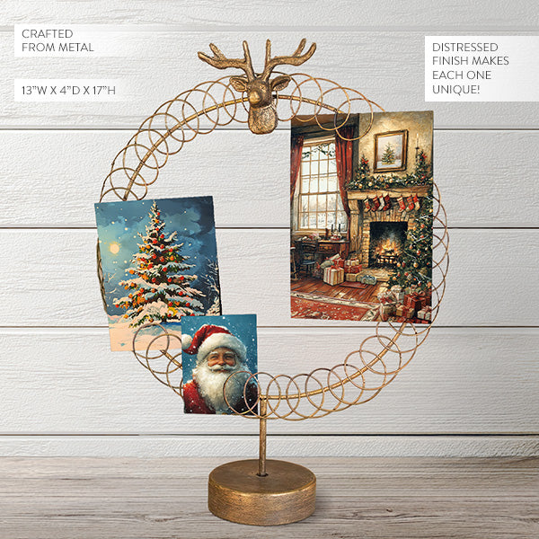 Crafted from sturdy metal with a charming distressed finish, this piece brings a touch of vintage farmhouse magic to any space. At 17 inches tall, it’s the PERFECT SIZE to display on a mantel, entryway table, or even as a centerpiece on your holiday buffet. The circular wire frame—topped with a whimsical deer head—adds character while giving you endless ways to show off what matters most: Christmas cards from loved ones, family photos, festive artwork, or even small keepsakes.