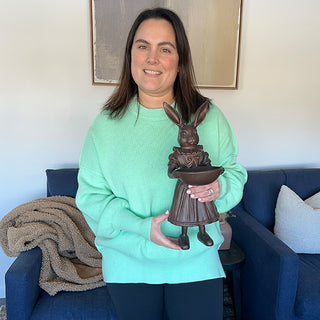 - Boy Bunny: Handsomely dressed in a dapper vest and bow tie, this gentlemanly rabbit has a smooth, polished finish resembling rich chocolate. His well-crafted outfit and confident stance make him an eye-catching display piece, ideal for holding small treasures or serving as a sophisticated candy dish.