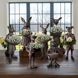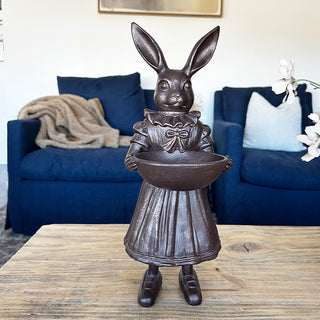 - Girl Bunny: Dressed in a flowing, meticulously detailed gown with a delicate bow at the collar, this refined rabbit brings storybook charm to any setting. With an antique bronze finish, she holds a bowl perfect for displaying wrapped treats, trinkets, or seasonal décor.