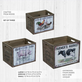 Set of Three Sizes: Includes three different-sized crates with coordinating artwork: a rooster & hen ("Rise & Shine Farms"), a pig ("Countryside Farm"), and a dairy cow ("Farmer’s Market").