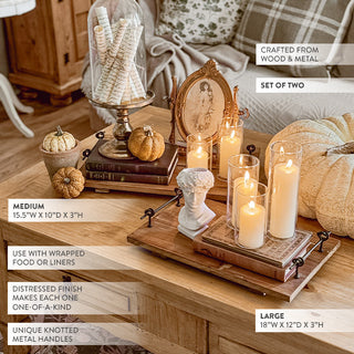 Our Rustic Wood and Metal Trays, Set of Two – the perfect blend of rustic charm and industrial flair for your home decor needs. Now available at a lower price for a limited time! These trays are not just functional; they're statement pieces that add character and style to any space. Shop with us and save – this set goes for double at other retailers! Don't miss out on this incredible deal.