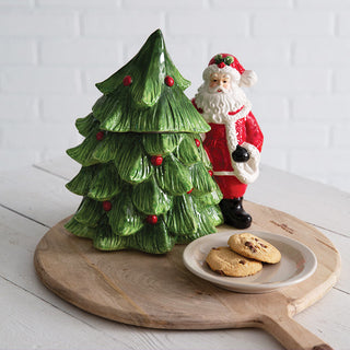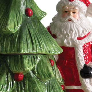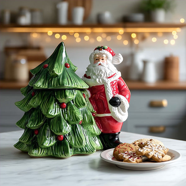 Introducing The Christmas Tree and Santa Cookie Jar, a centerpiece of pure holiday joy! This adorable ceramic jar features a jolly Santa hugging his beautifully decorated Christmas tree, and it's ready to hold all your favorite holiday treats. With its vibrant red and green colors and charming, classic design, it brings instant, cozy cheer to any countertop or buffet.
