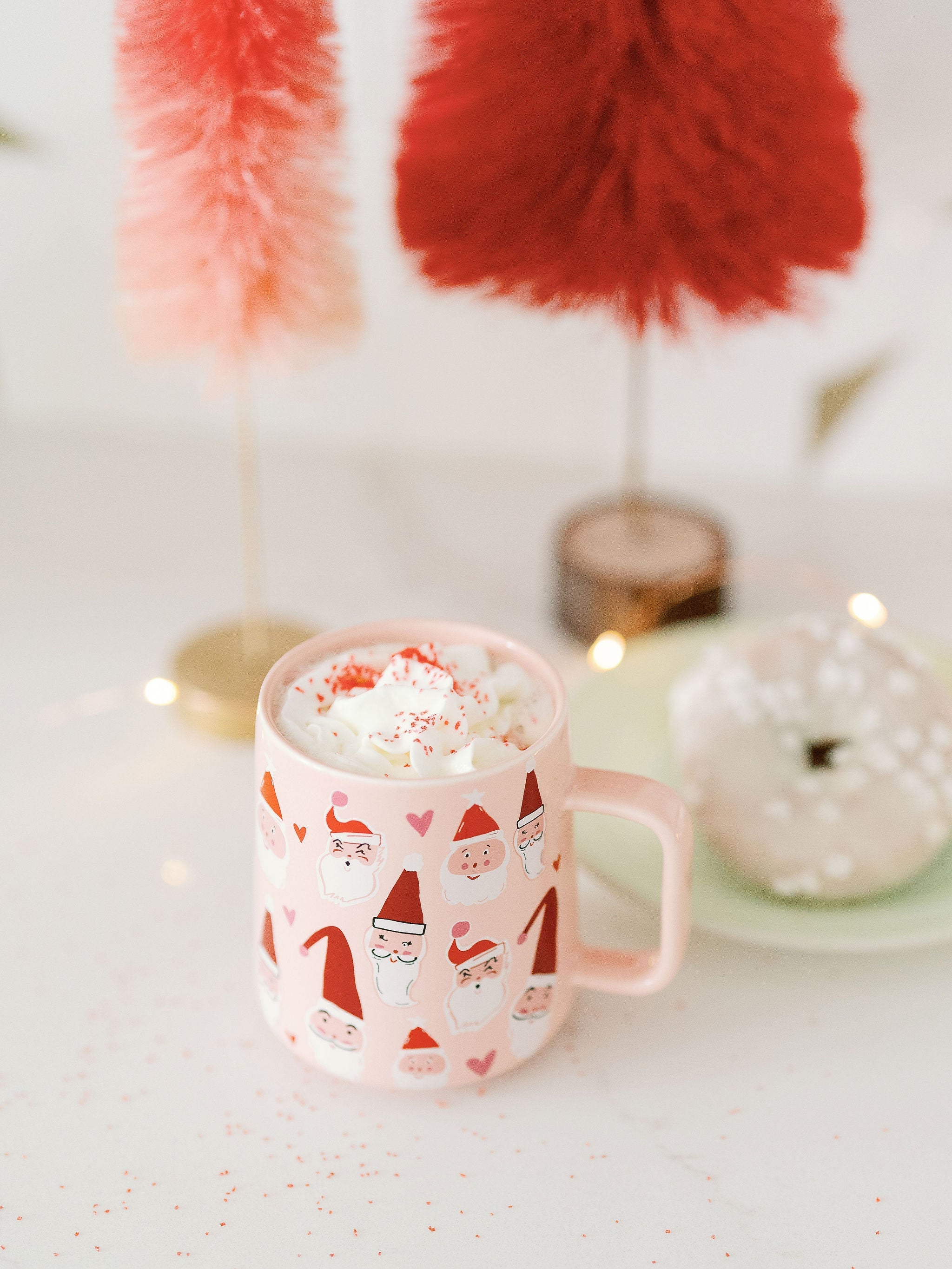 Sip on a delicious holiday beverage in this adorable Santa Mug! Featured in the sweetest shade of pink and adorned with cute little faces of Good ole Saint Nick. Best paired with a yummy bowl of soup in our Baking Bowl Bestie, an adorable pair of fuzzy socks, and a nostalgic holiday movie!