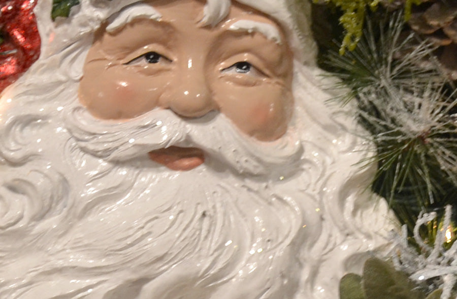 With the holidays approaching make your Christmas display a truly special one with our Santa Head Wall Plaque. Made of resin this three-dimensional representation of Old St. Nick features rosy cheeks a long white beard and a red hat decorated with holly in a beautiful metallic finish.