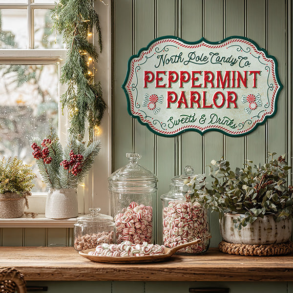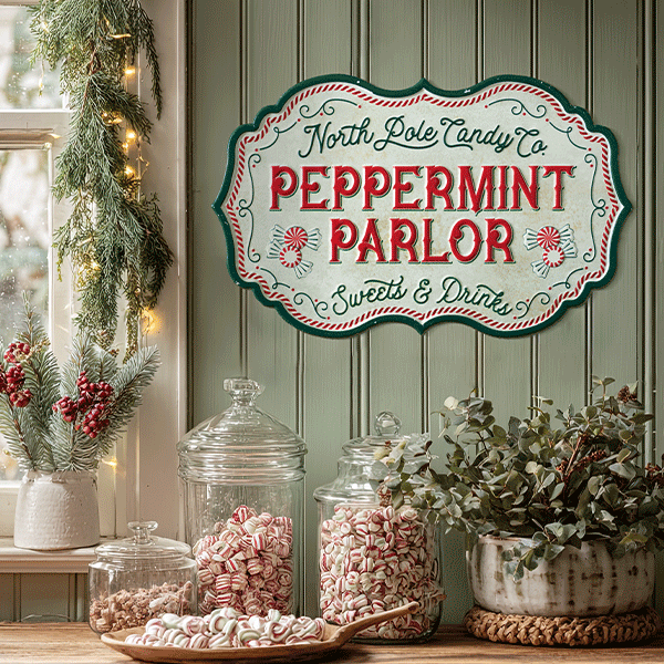 - Peppermint Parlor: "North Pole Candy Co. - Peppermint Parlor - Sweets & Drinks" in cream, red, and green