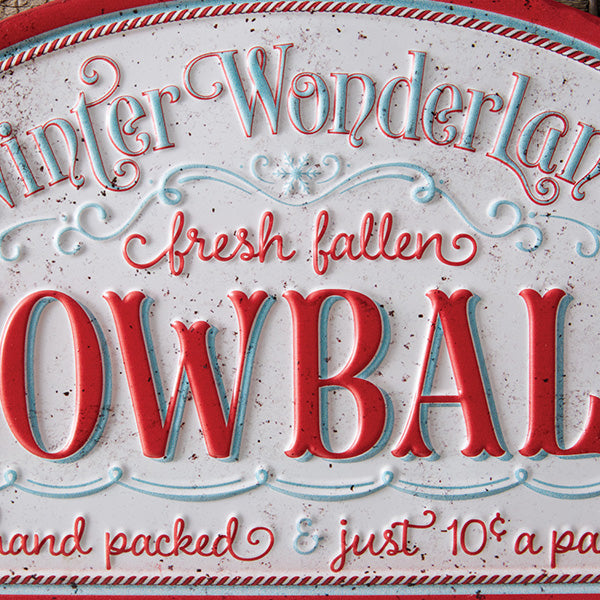 - Snowballs: "Winter Wonderland - Fresh Fallen Snowballs - hand packed & just 10¢ a pail" in cream, red, and blue