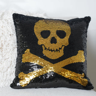 We mixed a pinch of glam with a little bit of Halloween spirit in our cauldron and came up with the perfect Halloween decorative accessory for your home! This Skull And Crossbones Decorative Pillow decorates your beautiful home for spooky season with black and gold sequins over a classic ghostly design.