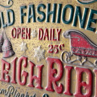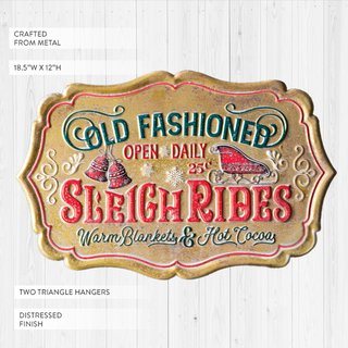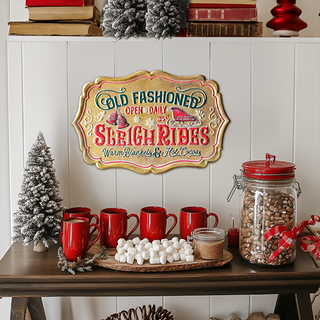 Step back in time with our Old Fashioned Sleigh Rides Wall Sign, a charming nod to nostalgic holiday traditions that brings warmth and cheer to your decor. This vintage-inspired sign features a festive color scheme, with classic red and green lettering on a gold background, inviting everyone to enjoy "Old Fashioned Sleigh Rides" for just 25 cents, along with the cozy promise of warm blankets and joyous sleigh rides.