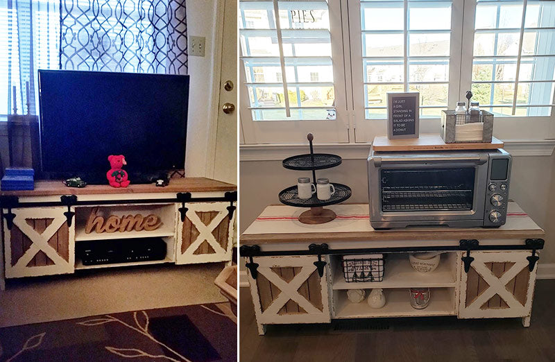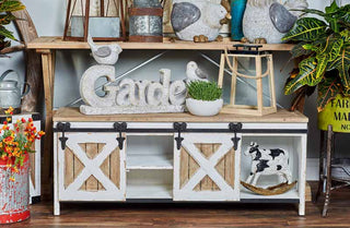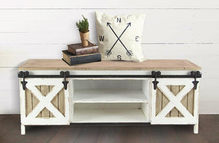 Barn door decor is the hottest trend out there! And this Barn Door Cabinet is not only functional it's really REALLY pretty! Use it as an oversized bench or even a TV stand! We just LOVE all the storage it provides! Fully sliding doors allow you to hide away messes while still leaving open shelving for hmmm well how about all those Rae Dunn pieces you have been dying to display ;)