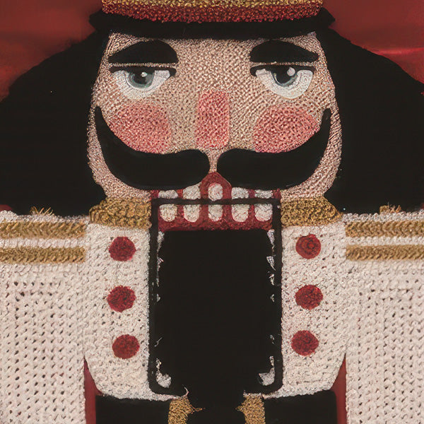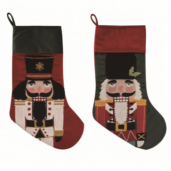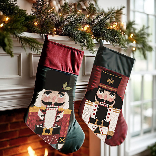 Each stocking in this duo tells its own story through intricate embroidery: one soldier stands at attention in his burgundy uniform with that iconic gold-threaded snowflake gleaming on his black hat, while his partner commands respect in green with holly details and a magnificent white beard you can practically feel.