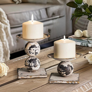 The Distressed Sphere Pillar Candle Holders aren't just functional; they're a decorative accent that enhances any space. With their distressed finish and unique sphere design, they add a vintage flair that's perfect for creating cozy, inviting atmospheres. Whether you're sprucing up your living room, dining area, or bedroom, these candle holders make a charming statement piece.
