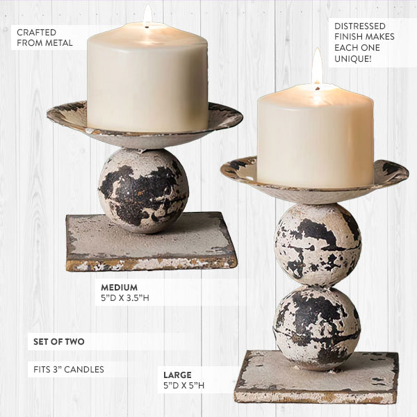 - Design: Crafted with a distressed finish, these candle holders feature a unique sphere design that exudes vintage charm. The intricate detailing and weathered look make them a standout piece.