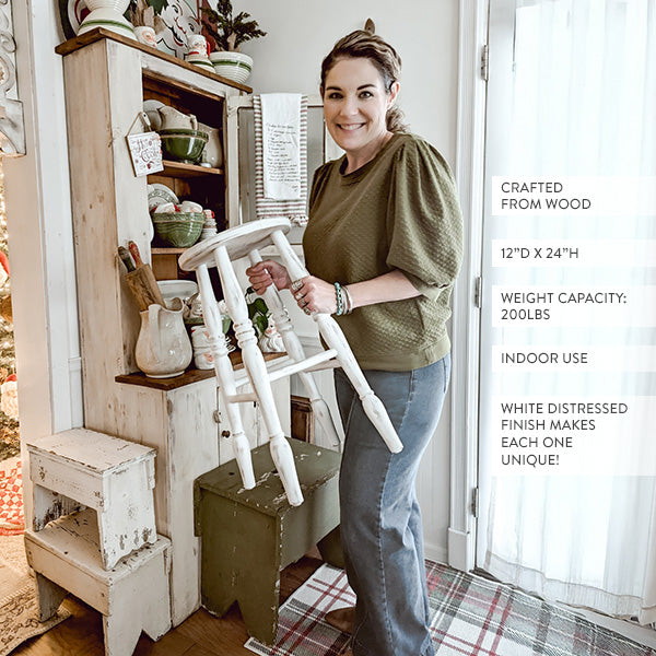 This Spindle Leg White Wood Accent Stool is a perfect addition to your farmhouse decor, blending timeless charm with everyday practicality. Imagine discovering this treasure in a cozy country home, its distressed white finish exuding warmth and rustic elegance. Now, you can bring that same farmhouse appeal to your own space.