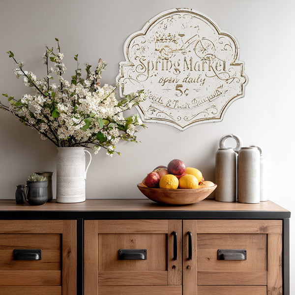 Step into a simpler time with this charming Vintage-Inspired “Spring Market” Embossed Metal Sign. Whether you’re curating a farmhouse-style kitchen, cozy garden shed, or welcoming entryway, this sign adds the perfect nostalgic flair. With its delicately aged finish and raised lettering, it evokes the spirit of springtime strolls, fresh-picked flowers, and bustling local markets where a bouquet cost just 5¢.