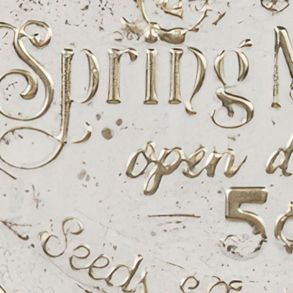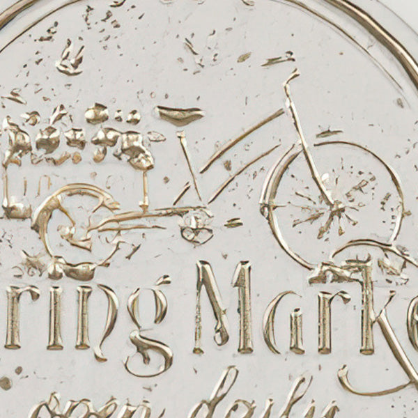 Timeless Design: Features elegant script that reads “Spring Market – open daily – 5¢ – Seeds & Fresh Bouquets” with a vintage-style bicycle overflowing with flowers.