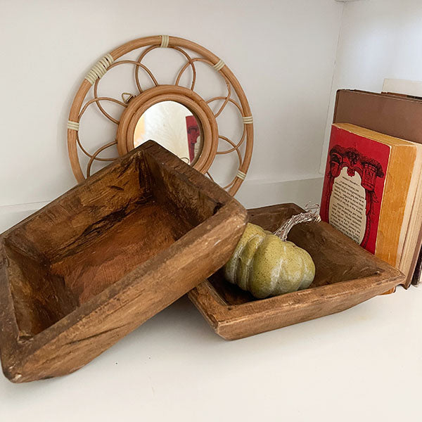 Use this Square Wooden Dough Bowls, set of TWO decoratively by placing them in your kitchen, bathroom, living room or bedroom and laying down some beautiful flower stems herb stems or cotton stems in them! We LOVE the idea of adding greenery and texture to your home by filling these with boxwood balls! You can ALSO change out the decor for the holidays by placing some pinecones in the bowls or poinsettias for the winter holidays or you can fill them with mini pumpkins for the fall holidays!