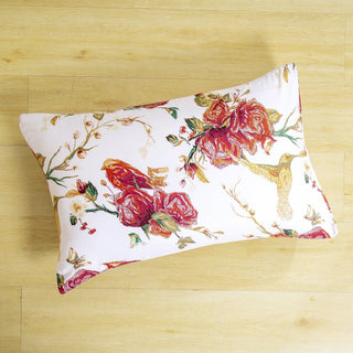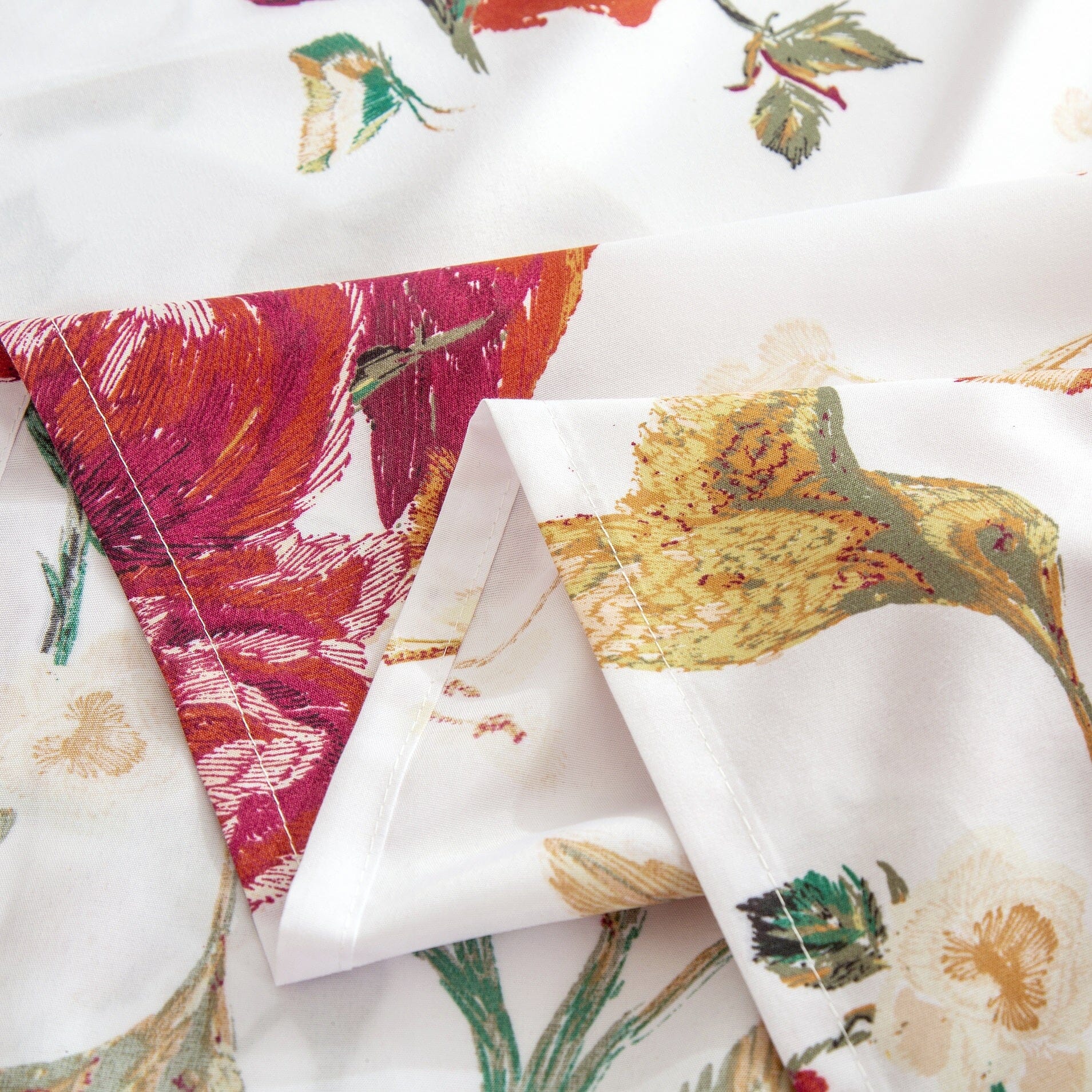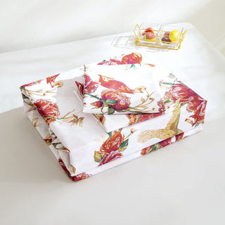 These sheets feature a lovely floral print with small finches sitting on the flowers and white background.