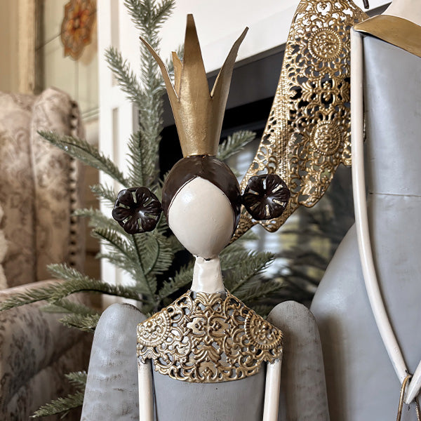 Ornate gold filigree cascades down their backs in intricate patterns that create depth, shadow, and genuine artistry. Pair that with the antiqued gold crowns, and you've got a look that walks the line between rustic farmhouse charm and sophisticated holiday glamour.