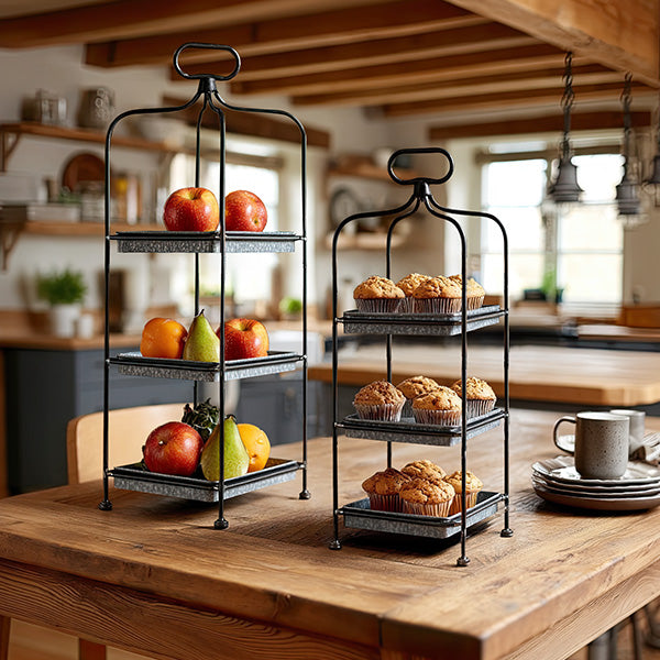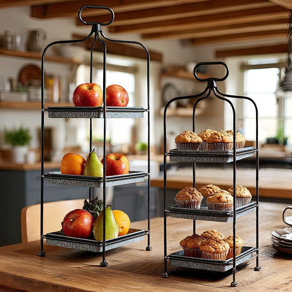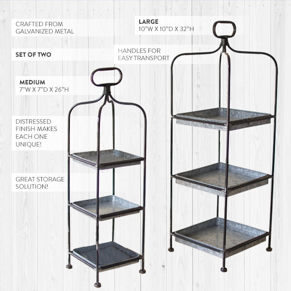 At the heart of these stands are the galvanized trays, imparting a rustic allure and providing an ideal platform to showcase your favorite decorative pieces. The slender, tall frames add a distinctive visual appeal without overpowering your surroundings, ensuring versatility across different rooms and occasions.