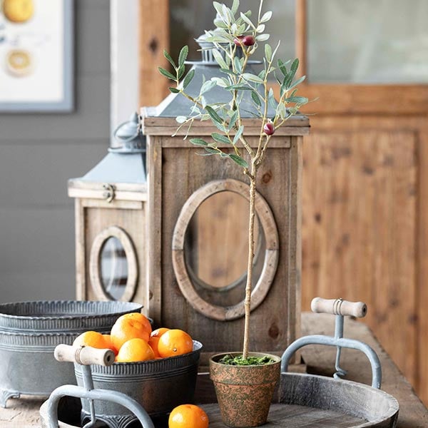 -Beautifully crafted of aged terracotta pot with faux olive topiary.