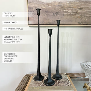 Bring height, warmth, and a touch of drama to your decor with this striking set of Iron Candle Holders. For a limited time only, take advantage of special pricing and add this must-have trio to your collection before they’re gone. A stunning statement piece that won't stay in stock for long!