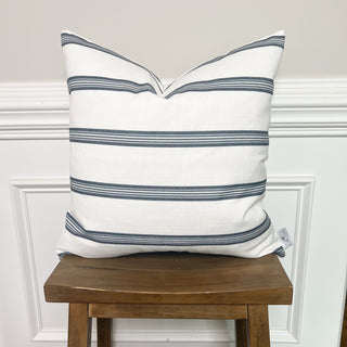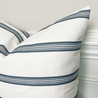 The Reece design is a stylish and versatile pillow cover design that features beautiful navy stripes on a linen like textured white background. This pillow cover measures 18x18 inches. We suggest pairing it with a 20x20 insert or a 22x22 insert for a nice fuller look.