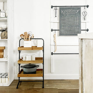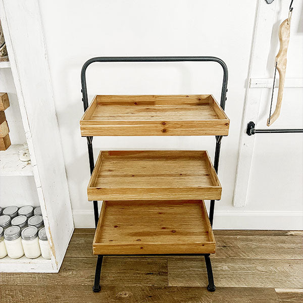 This vintage farmhouse Three Tiered Farmer's Market Shelf just exudes charm and personality and has LOADS of character! We can see this styled in your entryway to collect your shoes, hats, gloves, purses, bookbags, doggie leashes and wallets! This Three Tiered Farmer's Market Shelf will be the PERFECT piece to keep all your toilet paper, rolled hand towels, Q-tips, magazines, lotions, and extra shampoo and conditioners in your bathroom! We can see this styled in your kitchen to hold your spices, herbs and pots and pans! Who doesn't need extra kitchen storage?! Place this Three Tiered Farmer's Market Shelf in your living room or dining room to hold your favorite small potted plants, books, remotes, and picture frames! This would also be the perfect stylish storage solution in your office to organize your paperwork, books, or office supplies! You can’t go wrong wherever you style it!