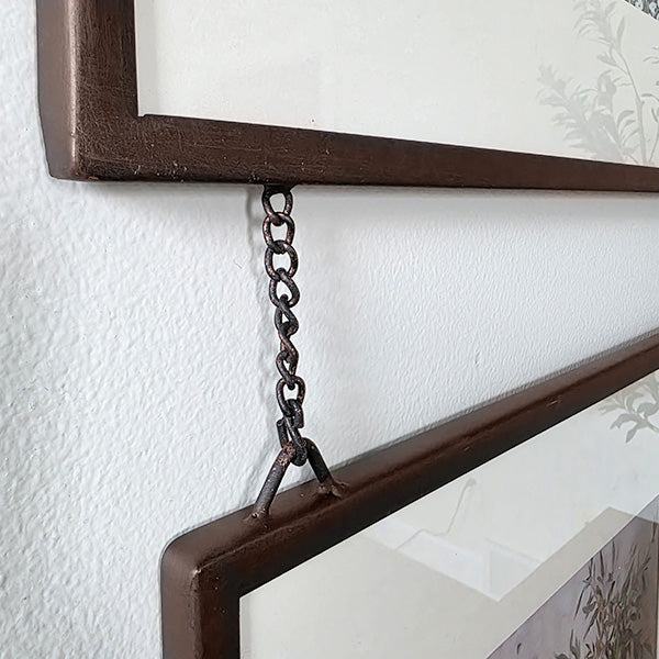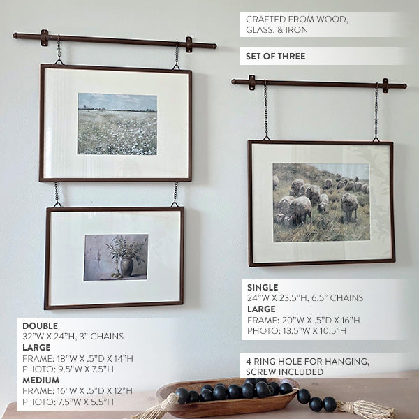 - Double: 32"W x 24"H with 3" chains, holds 18"W x .5"D x 14"H frame (Large), and 16"W x .5"D x 12"H frame (Medium)