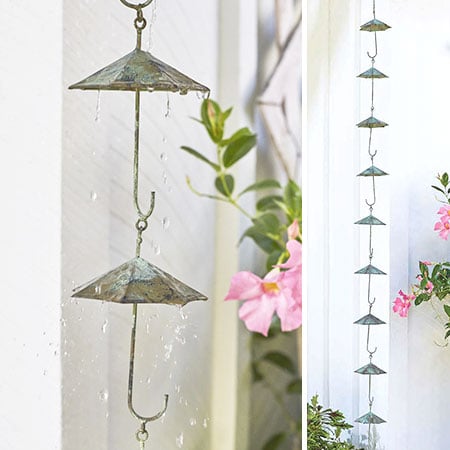 Replace your plain gutter downspout with the whimsical charm and beauty of our decorative UMBRELLA INSPIRED l rain chain. PERFECT for spring! For hundreds of years the Japanese used rain chains similar to this one to transport rainwater from roofs into large barrels. They have recently become a popular substitute for a downspout with the intention of being both aesthetically pleasing and functional.