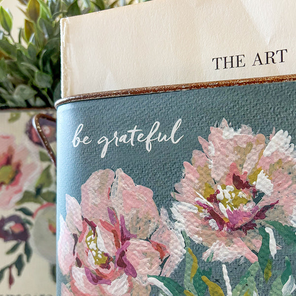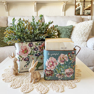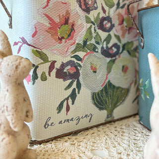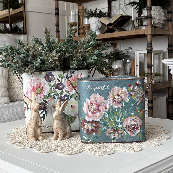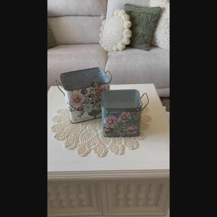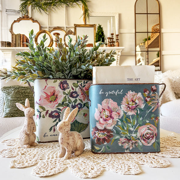 Add charm and inspiration with this floral metal bin duo—one says “Be Amazing”, the other “Be Grateful.” Perfect for stylish storage or display!