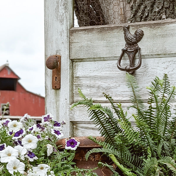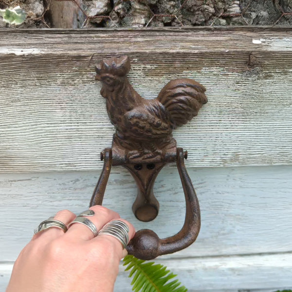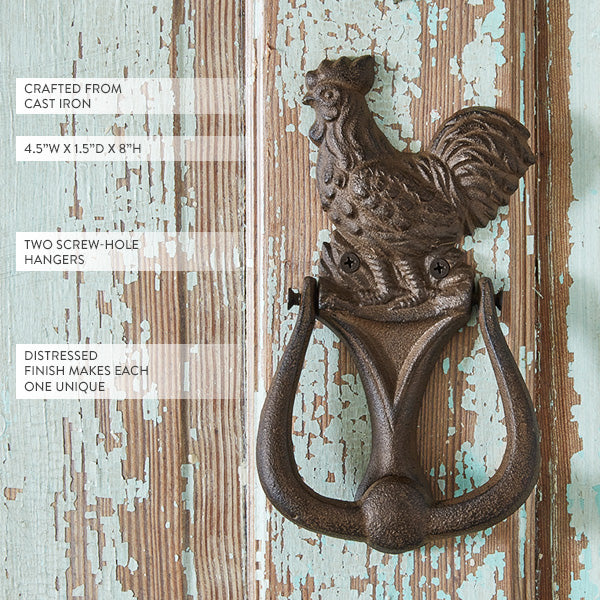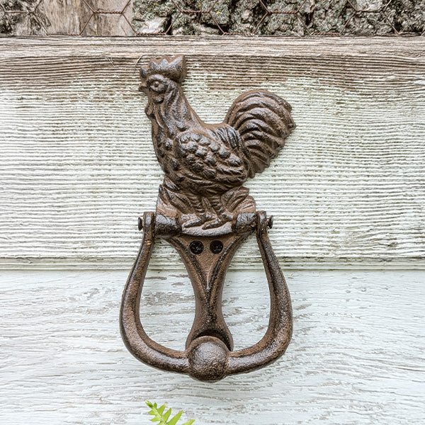 Add instant rustic charm to your home's entrance with this beautifully detailed cast iron rooster door knocker. Featuring traditional farmhouse styling with an aged patina finish, this functional piece combines old-world craftsmanship with timeless country appeal.