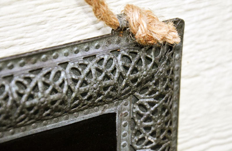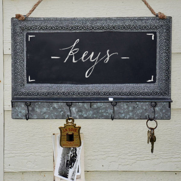 -Salvaged looking metal frame with chalkboard surface and metal hooks