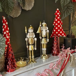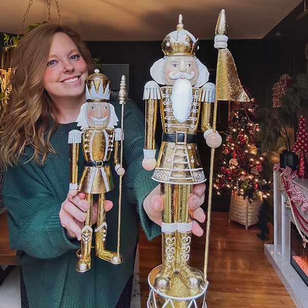 This set includes both a Large (16.5" tall) and Medium (14.5" tall) nutcracker, so you can create that perfectly balanced display without hunting down matching pieces. Both are crafted from metal with a distressed gold finish that catches the light just right. The white beards, crowns, and military details? Absolutely stunning.