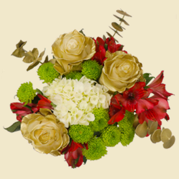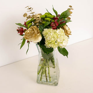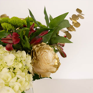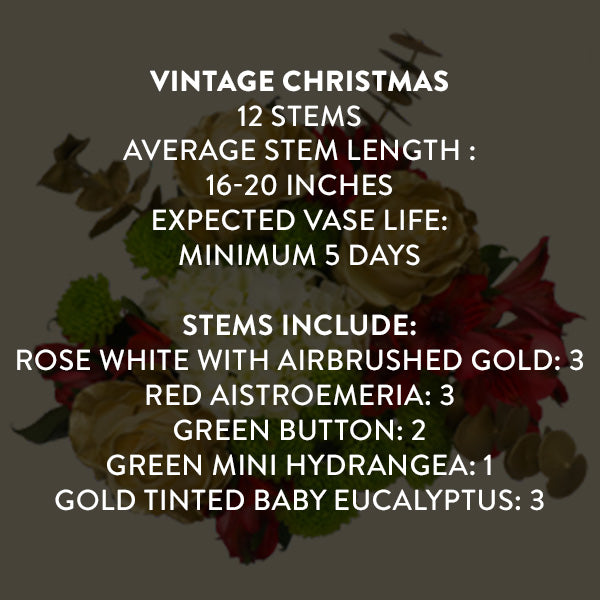 Add a touch of timeless charm to your holiday décor with the ""Vintage Christmas"" bouquet. This captivating arrangement features white roses airbrushed with gold, vibrant red alstroemeria, cheerful green buttons, lush green mini hydrangeas, and delicate gold-tinted baby eucalyptus. Perfect for festive gatherings or as a thoughtful gift, this bouquet brings vintage-inspired beauty to any setting.