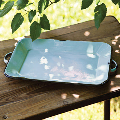 Our enamelware tray embraces vintage styling with an exclusive soft blue egg color inspired straight from nature. The original enamel trays were used years and years ago in the medical field in photo processing in delis as baking pans in general stores... Literally everywhere you can think off!