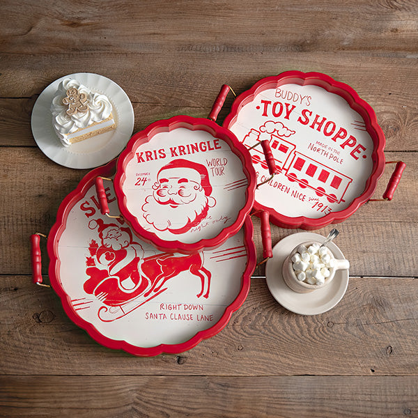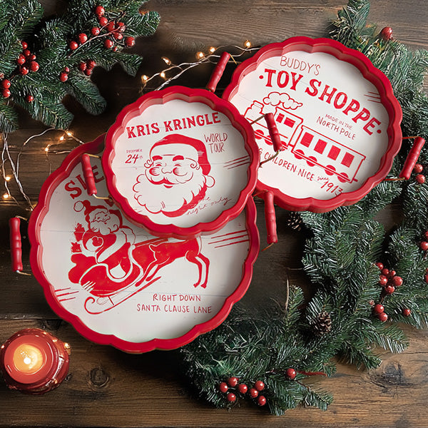 Add a vintage charm to your Christmas decor with this set of three Vintage-Inspired Festive Christmas Trays with Handles. Each tray is uniquely adorned with nostalgic holiday graphics, including a joyful "Kris Kringle" Santa, a "Sleigh Rides" scene with Santa in his sleigh, and a "Buddy's Shoppe" featuring a whimsical holiday train. Perfect for adding a festive touch to any gathering, these trays bring both holiday cheer and practical function to your home.