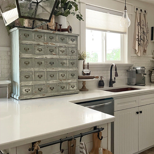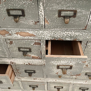 Designed after a true antique, our Vintage Inspired Library Card File Cabinet provides the perfect storage solution for your smaller supplies and essentials. This shabby chic chest of wooden drawers has a functional design, distressed finish, and tons of rustic appeal that will trick anyone into thinking you paid big money at an antique store!