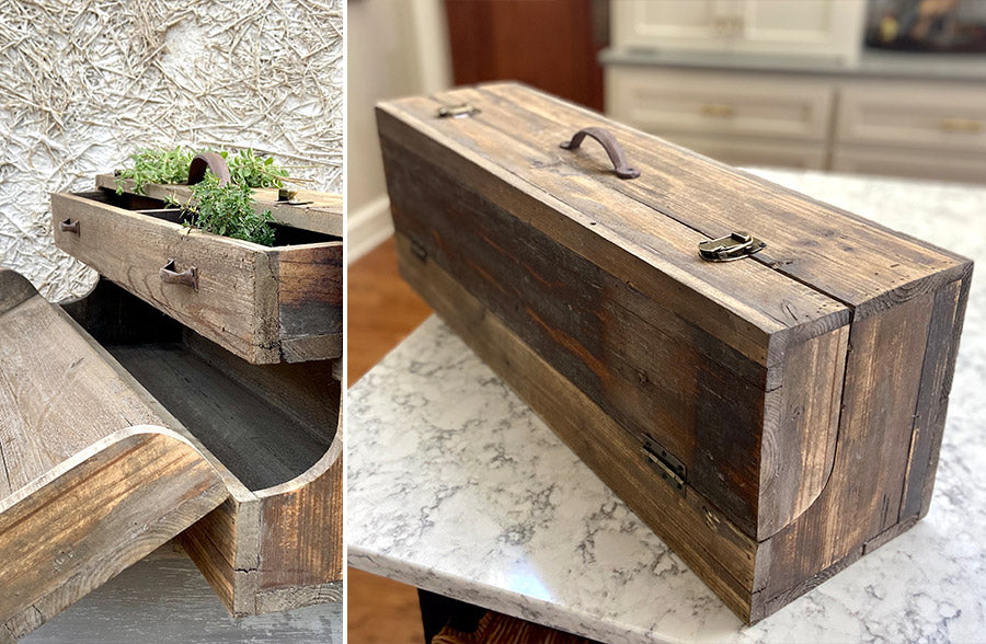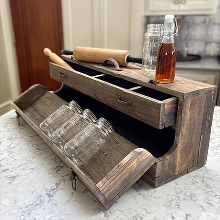 This Vintage Inspired Salesman's Wooden Storage Box is the ideal size for any kitchen countertop... and OHHH, the possibilities for what to put inside!! What about wrapped candies for an after dinner treat for the kiddos?? Or maybe items such as coffee pods, tea bags and sugar packets - perfect for your beverage station!! Get creative! You could even use this storage box in your bathroom to store cotton balls, dental flossers and other toiletries! Featuring a fold down cubby AND a pull out drawer... this wooden storage box will be the PERFECT display piece in ANY room!