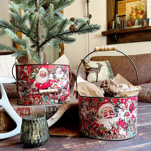The Vintage Inspired Santa Patterned Buckets, Set of 2, are here to sprinkle a little holiday magic all around your home! These buckets are jacks-of-all-trades, perfect for countless festive uses. Imagine filling them with your favorite holiday treats, using them as adorable planters for poinsettias, or even letting them steal the show as part of your holiday centerpiece. These buckets aren't just practical; they’re here to spread joy and nostalgic cheer!