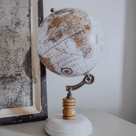 This stylish desk globe features a white marble and natural wood stand, along with an antique brass metal arc, giving a vintage-inspired look that is sure to stand out. Display this sophisticated globe on a desk or shelf and add the perfect statement-making piece to your space.