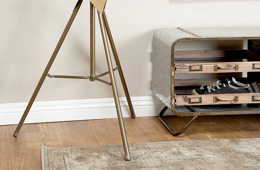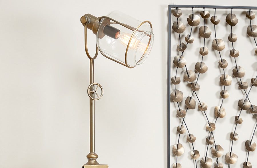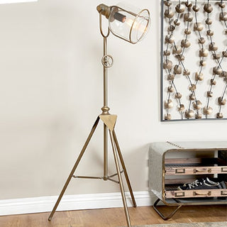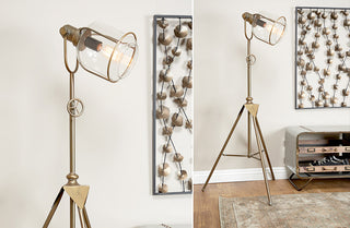 Our metal and glass tripod floor lamp will highlight the look of any room in your home. Simply add an Edison bulb to this light fixture and instantly add a dramatic look to your living space or office.
