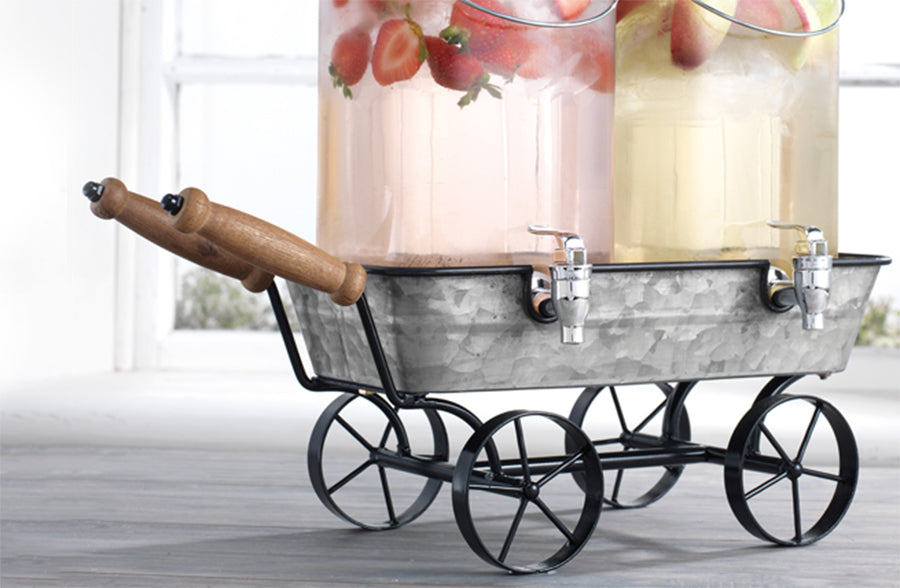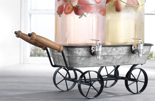 Its beautiful sturdy glass and galvanized metal wagon make this piece one of a kind! Forget handheld pitchers that have you running back into the kitchen every 10 minutes to refill! Spend more time relaxing and enjoying. Let this pretty thing do the work.
