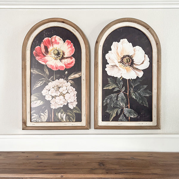 This thoughtfully designed set features vibrant coral blooms, creamy white florals, and lush greenery layered against a rich, moody black background. Finished with distressed arched frames, it delivers that timeless farmhouse charm that works beautifully in kitchens, entryways, dining rooms, and beyond—making it a standout statement without overpowering your space.