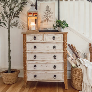The Two-Toned Weathered Wooden Chest of Drawers is a rustic farmhouse-inspired masterpiece that exudes timeless elegance and antique charm. With its limited quantity, this chest won't be around for long—act now before it sells out! Crafted with meticulous attention to detail, this exquisite piece offers the perfect solution for organizing your essentials with sophistication and style, while infusing your space with rustic allure.