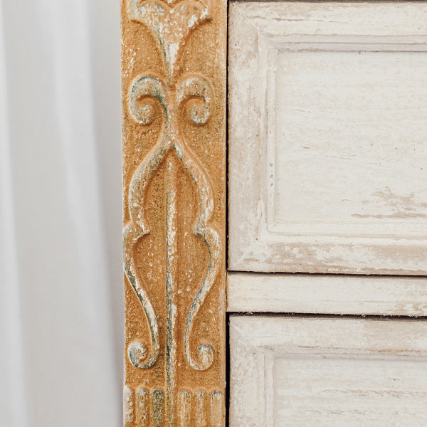 - Featuring a functional design, the Wooden Chest of Drawers boasts intricately carved accents that add a touch of refinement to its shabby chic aesthetic.