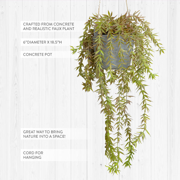 Elevate your interior décor with our Weeping Faux Plant nestled in a Hanging Concrete Pot. This meticulously crafted artificial plant brings the beauty of nature into your space without the hassle of maintenance. Perfect for adding a touch of greenery to any room, this elegant piece enhances the ambiance with its lifelike appearance and modern design.