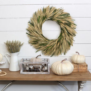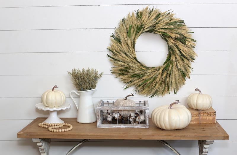 There isn't ANYTHING that can make a space more farmhouse OR inviting the way wheat can! So hang our beautiful faux Wheat & Cycas Leaf Wreathes in your home boutique cafe or store and allow it's homey qualities enchant your space! The subtle creamy yellow and green features of this wreath will brighten up any space while adding texture too!