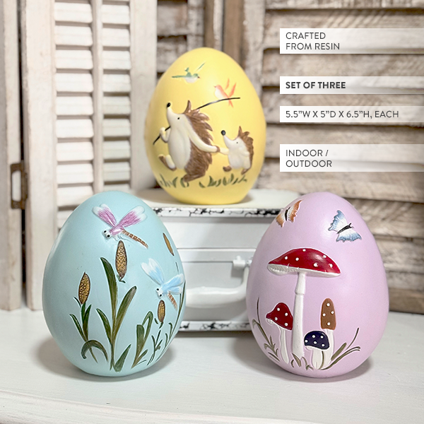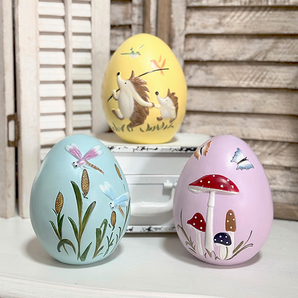 Hand-Painted Woodland Charm – Features a sunny yellow egg with an adorable hedgehog, a soft blue egg with dragonflies dancing among cattails, and a blush pink egg with a whimsical mushroom scene—each one uniquely detailed and full of personality.
