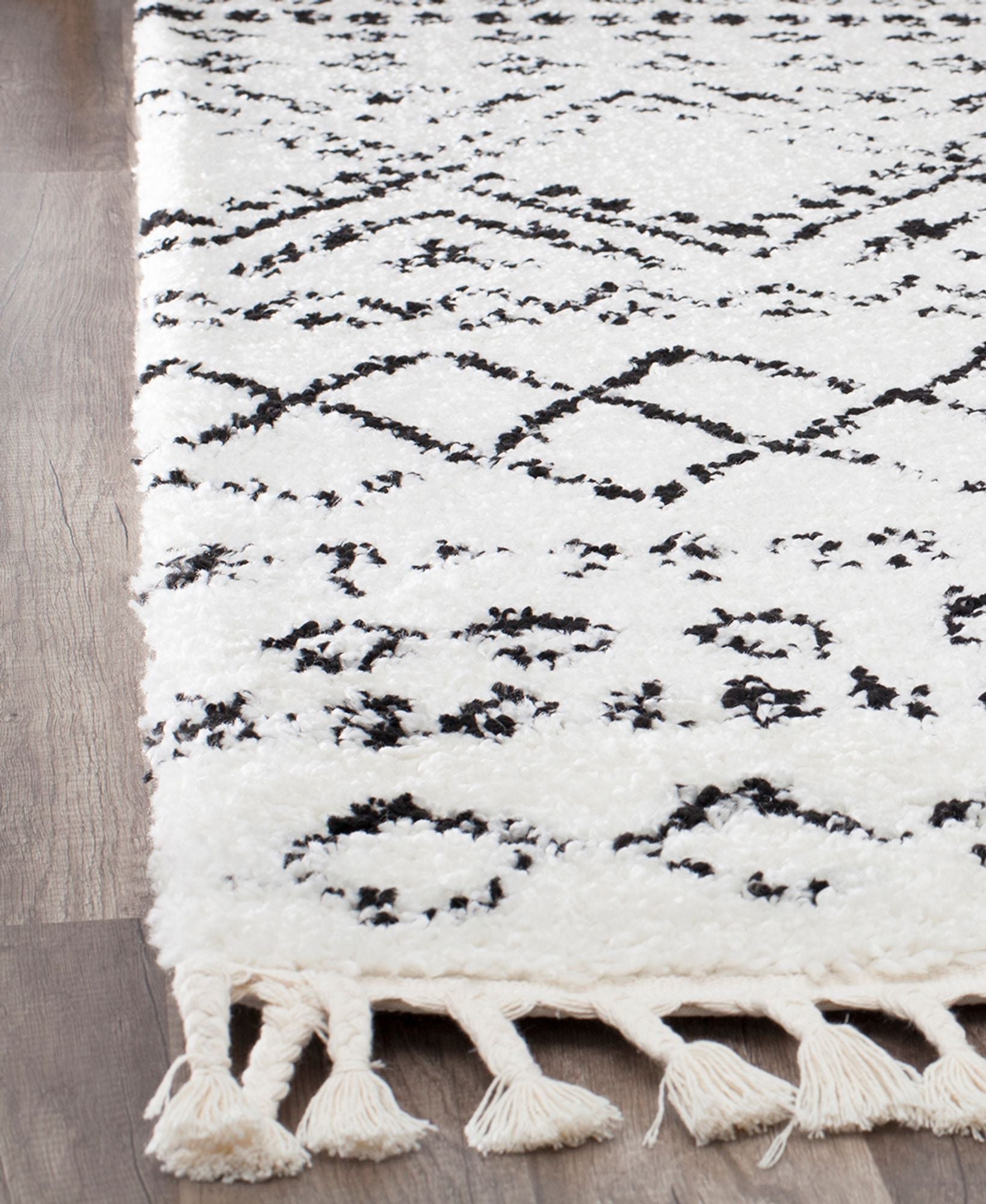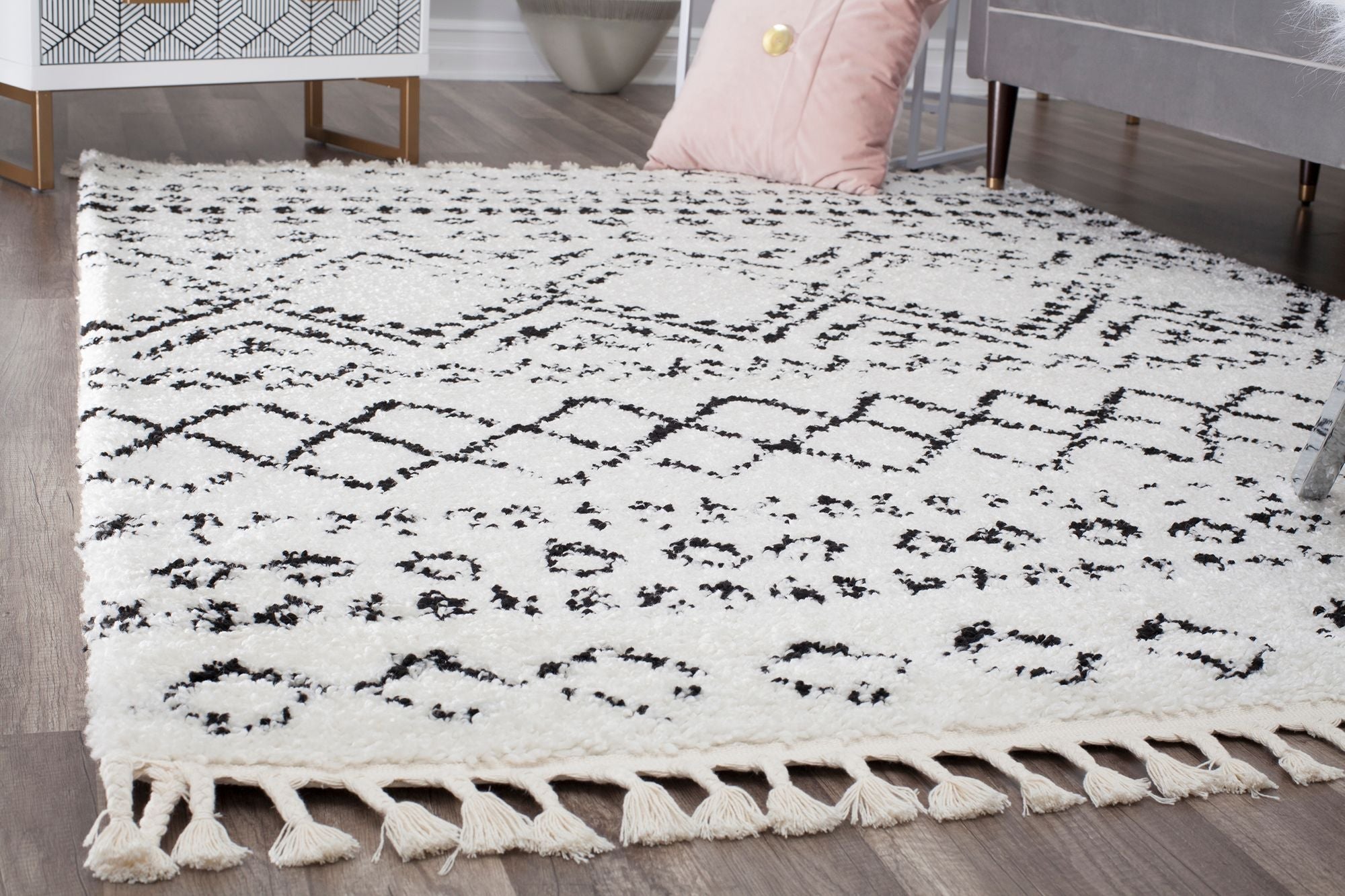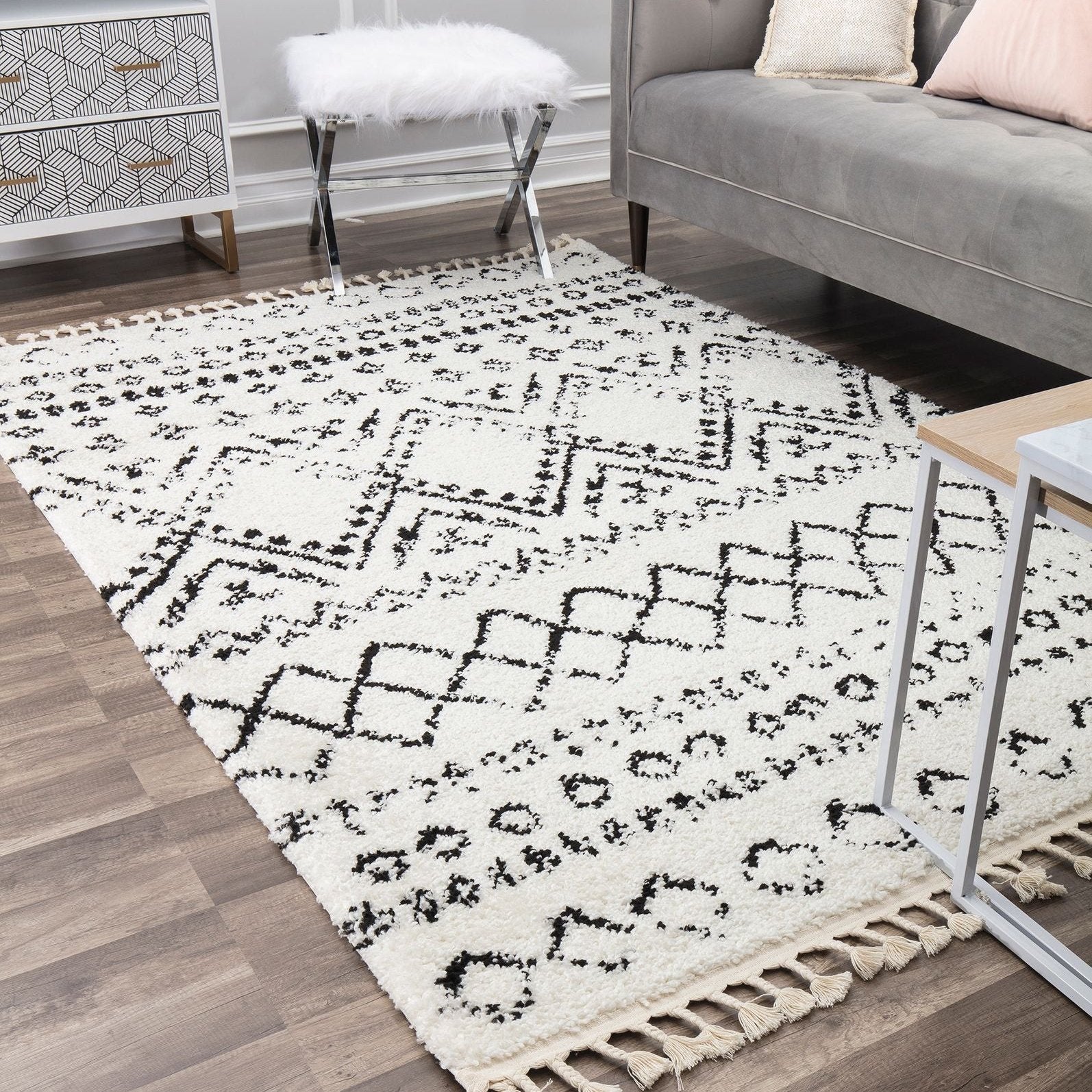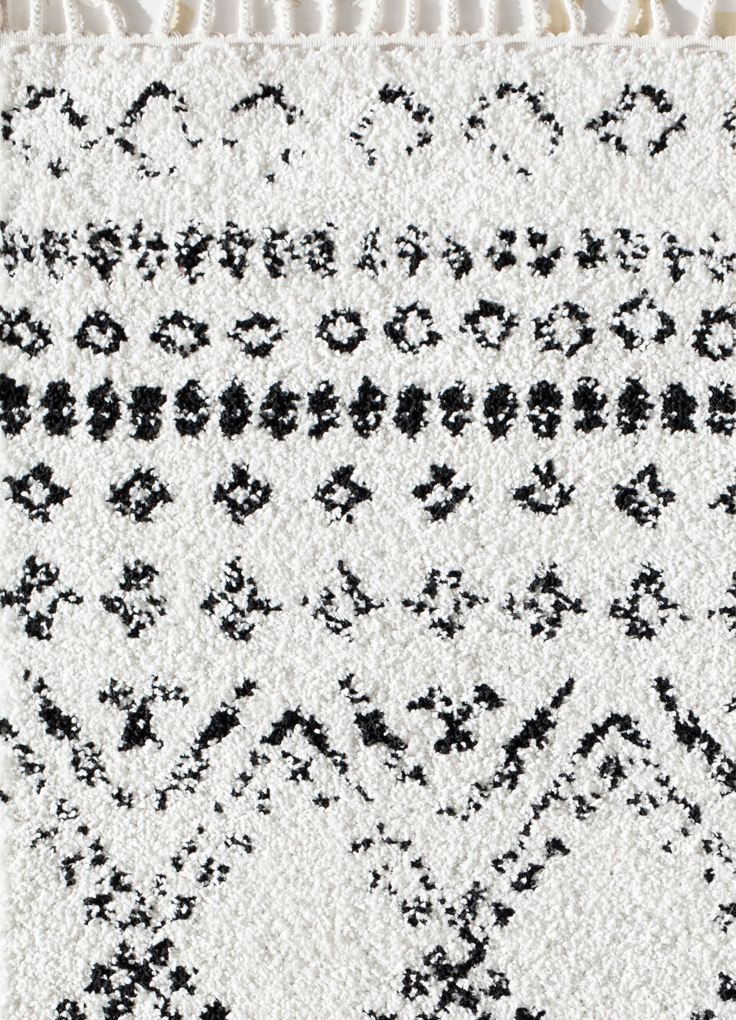 Introducing the Whisper White Area Rug—a standout piece. Featuring rows of traditional Moroccan patterns in a faded black-and-white tribal motif, this rug brings a calming touch with its soft-touch high pile. Perfect for adding a stylish and comfortable touch to any room, the Shag Tribal White Area Rug combines traditional design with modern comfort. Elevate your home decor with this beautiful and cozy rug.